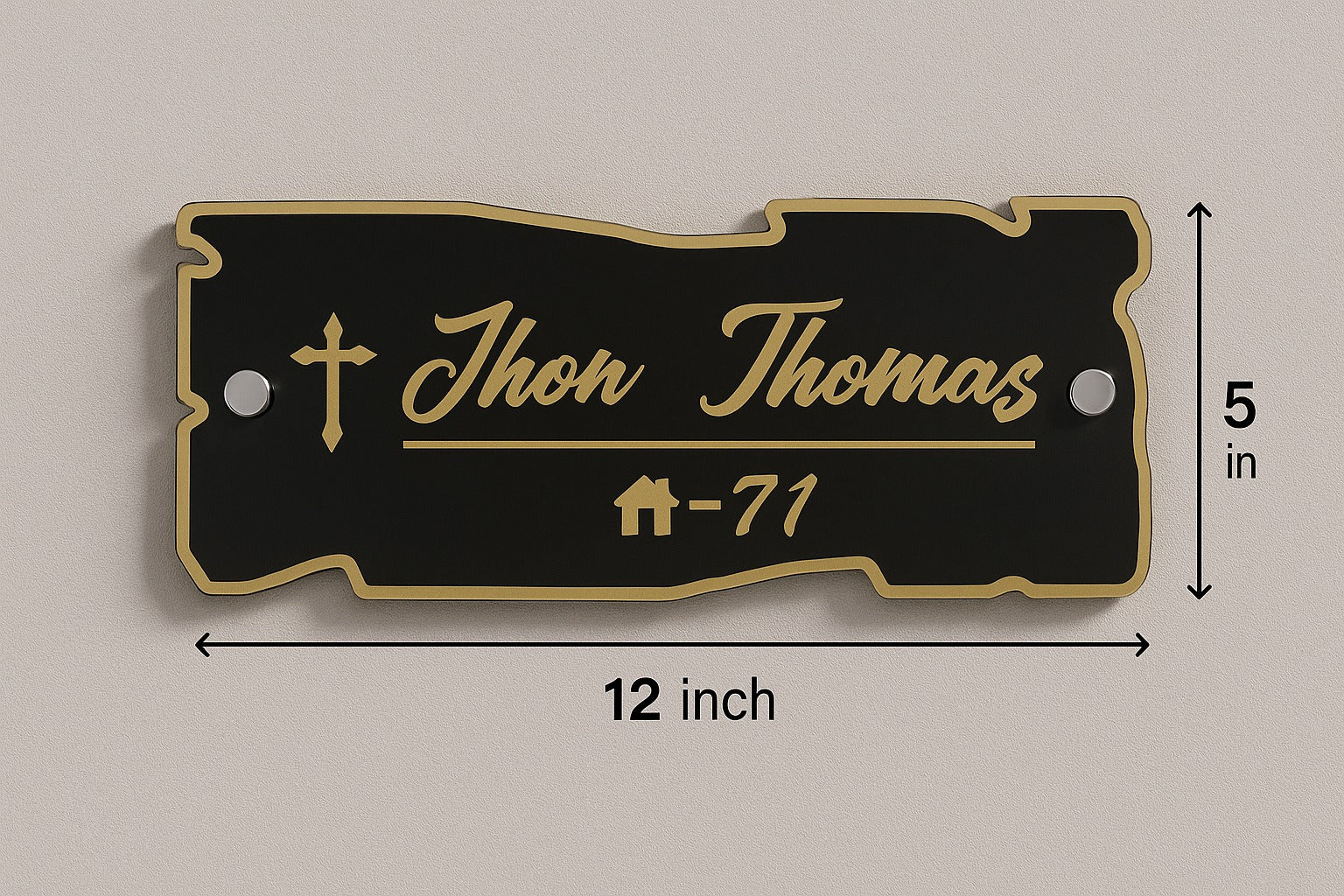 This premium acrylic name plate features a glossy finish and clean lettering. Designed to enhance your home or office entrance with a stylish and professional appearance.